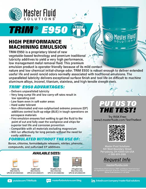 Metalworking Fluids Guide Metalworking Fluids Glossary Metalworking Industry Directory Sitemap/Search Tech Line Blog FAQ - Frequently Asked Questions Send A Sample Brochures Data Sheets Case Studies Technical Bulletins Technical Articles Tech Tips Press Releases Coolant Makeup Calculator Master Product List Videos TRIM Run Chart Seminars+Training Customer - Coolant Management Solutions Distributor - Maximizing Your Coolant Sales On-site - Customized for the Customer On-site - Customized for the Distributor
