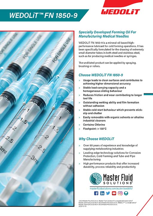 Specially developed for manufacturing medical needles, WEDOLiT FN 1850-9 is a mineral-oil based high-performance lubricant for cold forming operations.